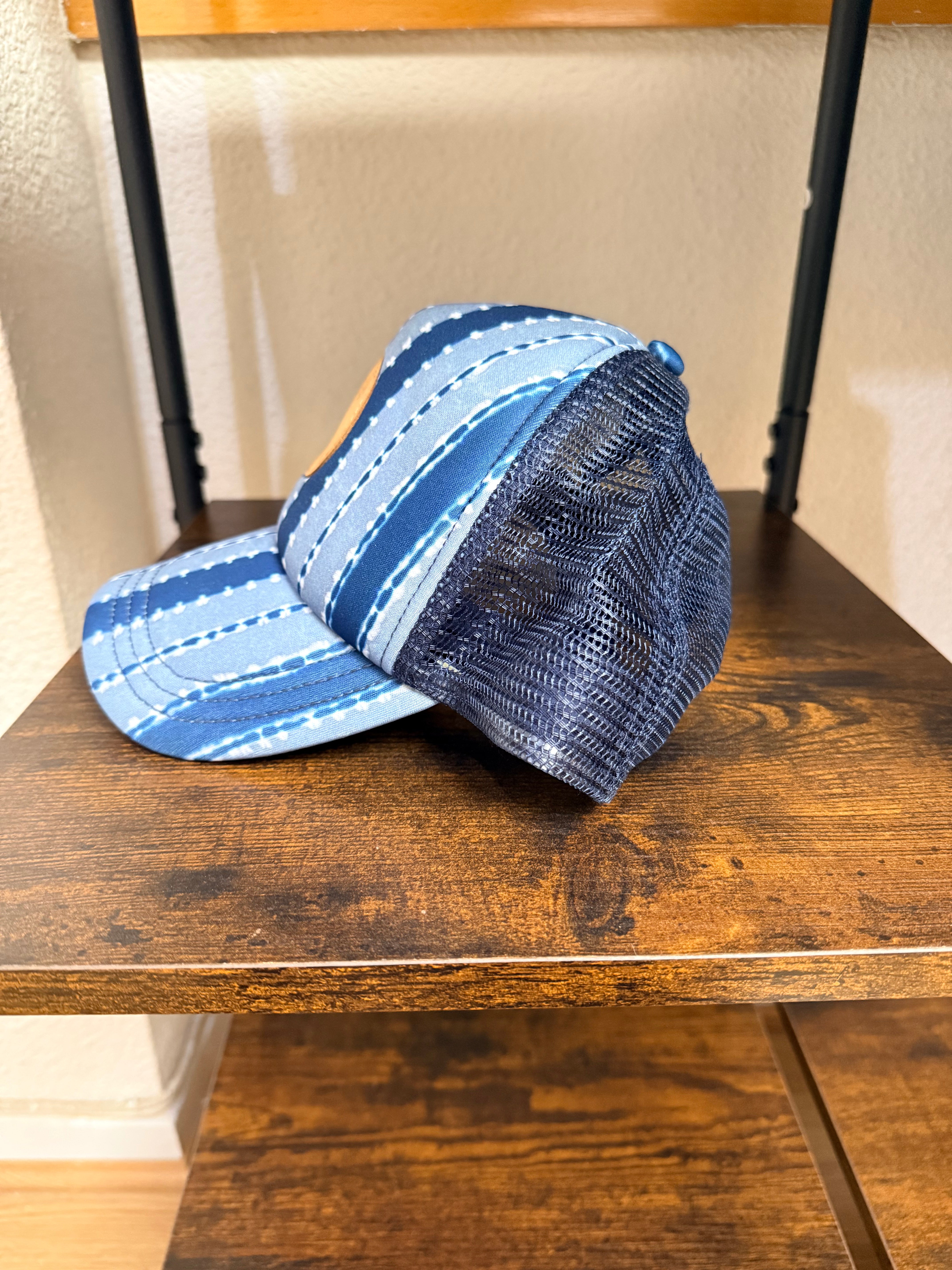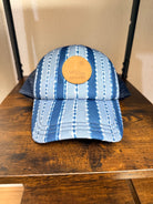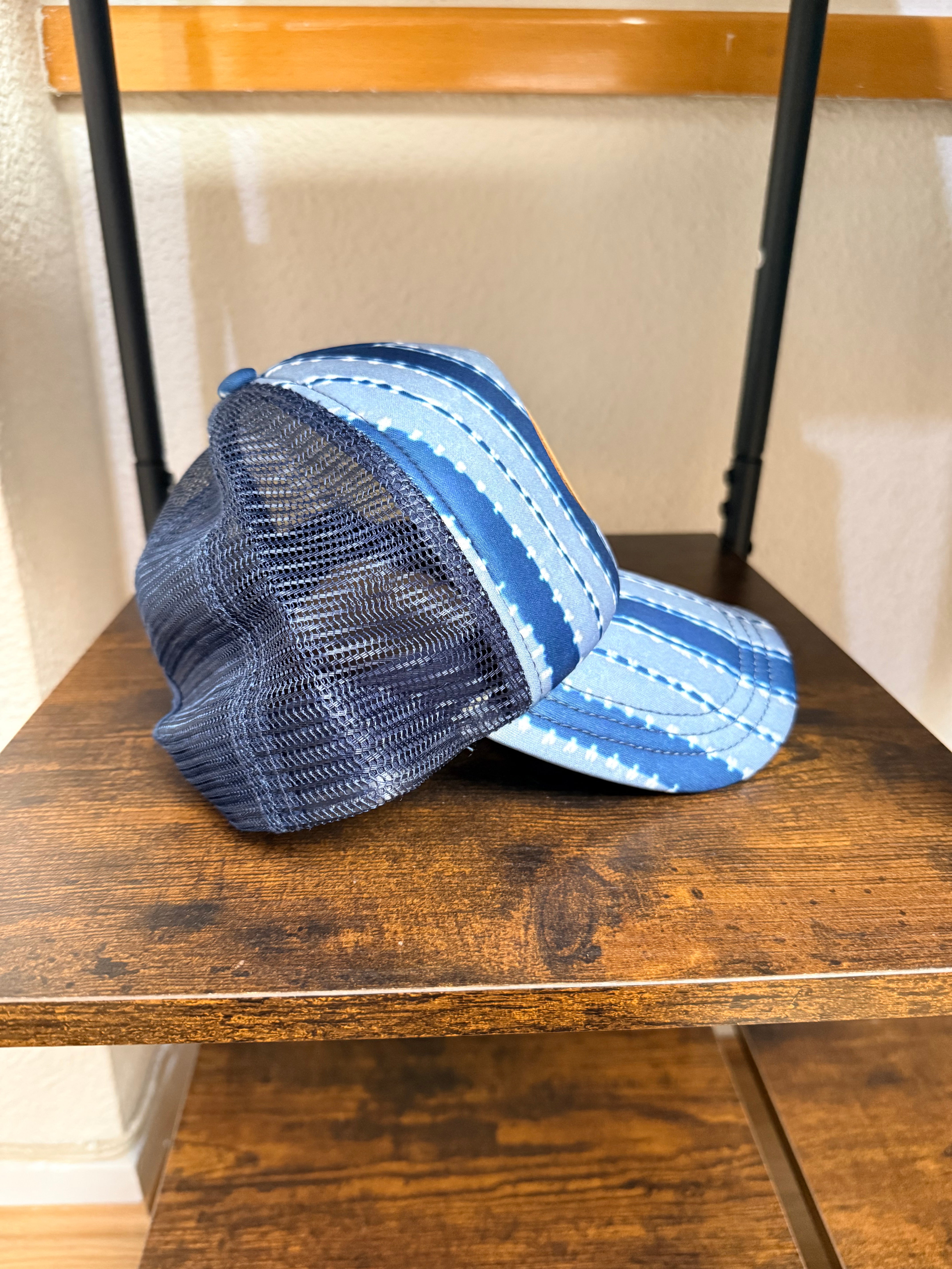 Gorra Rip Curl estilo trucker, con diseño en tonos azules y estampado tipo tie-dye a rayas que aporta un look veraniego y surfero característico de la marca.