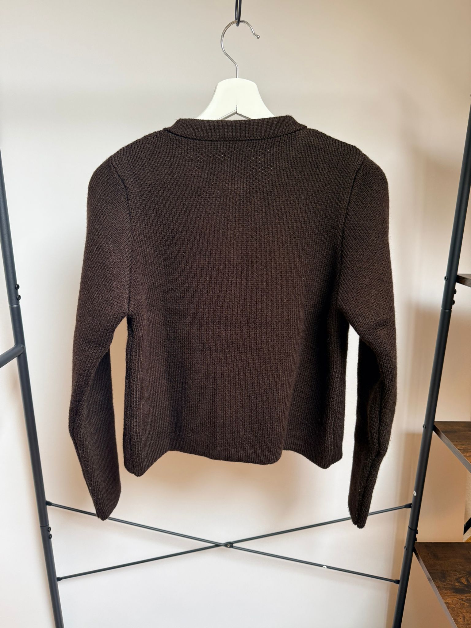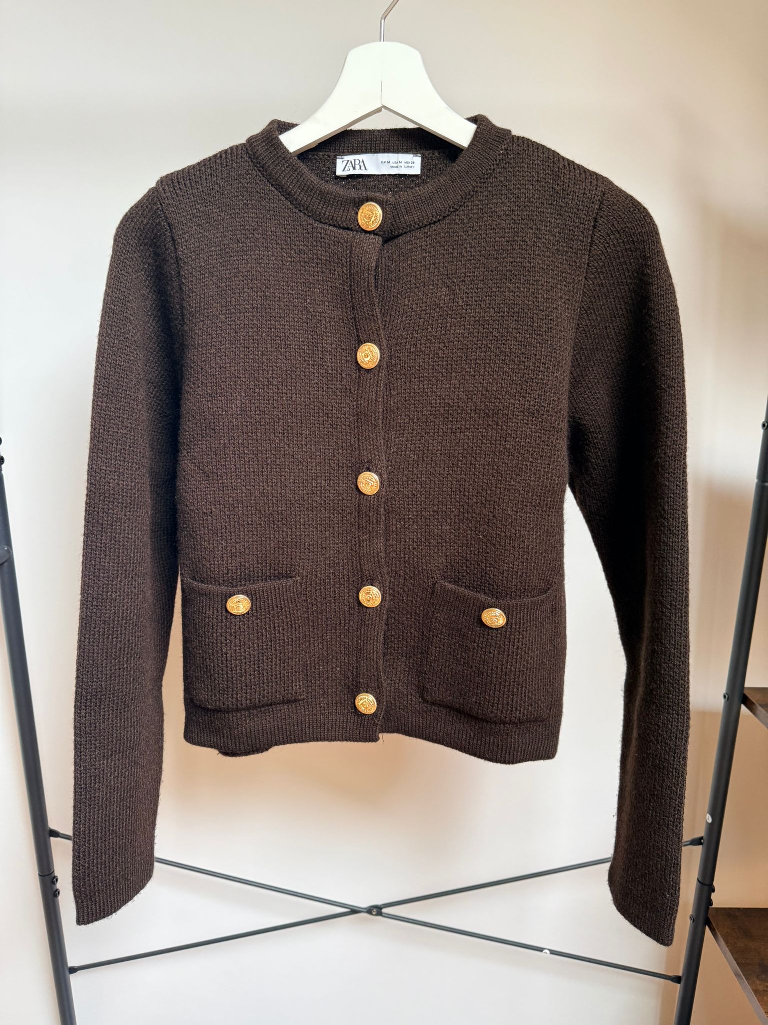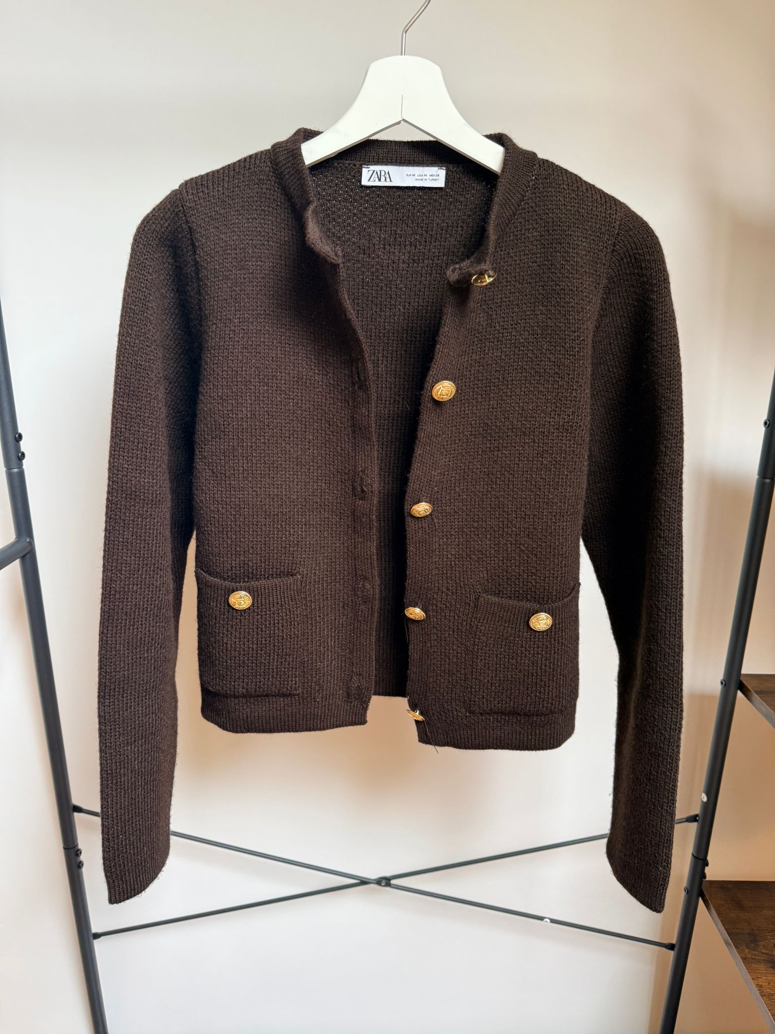 Chaqueta de punto Zara en color marrón oscuro, con diseño elegante inspirado en el estilo clásico tipo cardigan estructurado. Destaca por sus botones metálicos dorados decorativos y sus dos bolsillos delanteros, que aportan un aire sofisticado y atemporal.