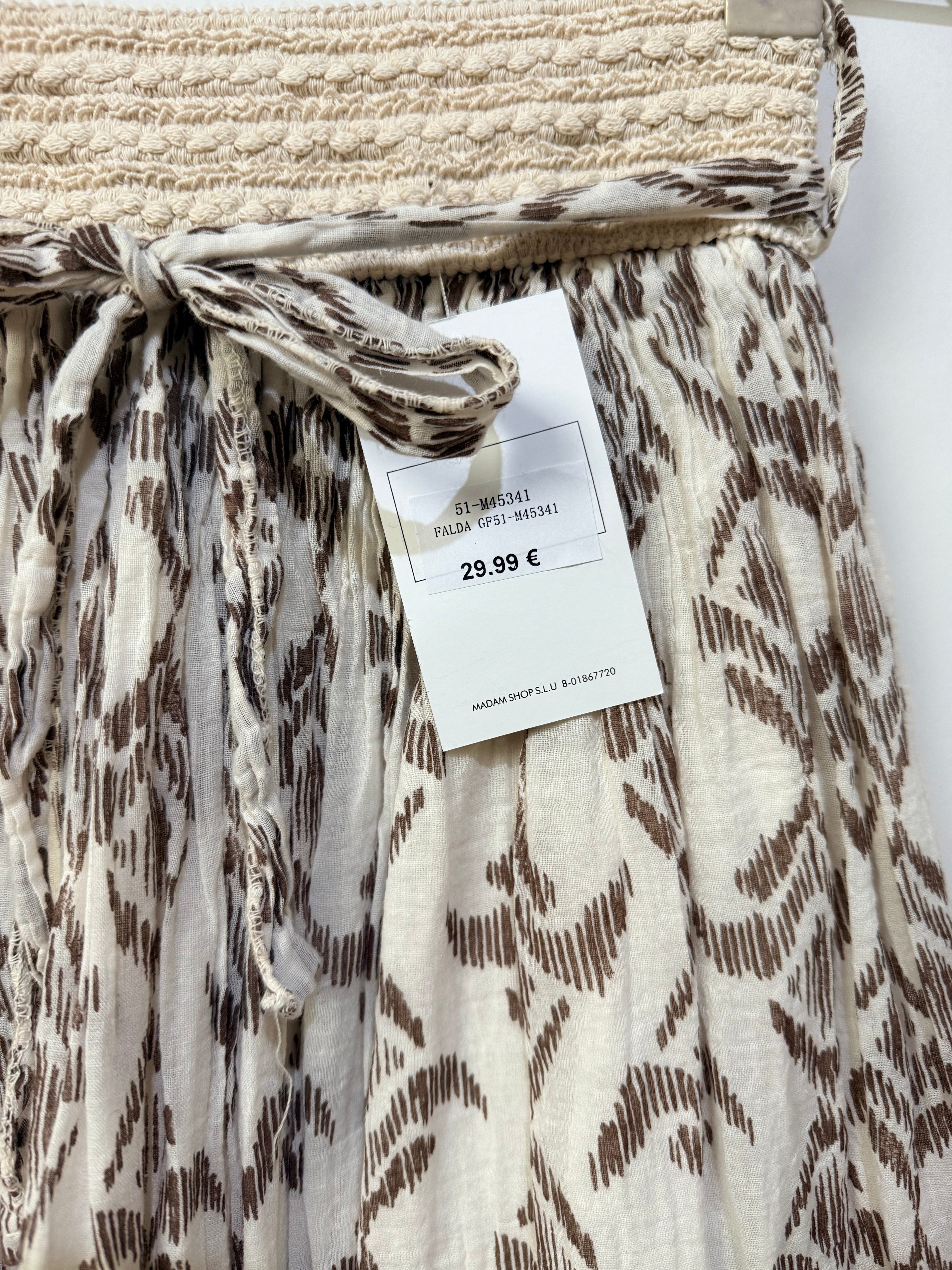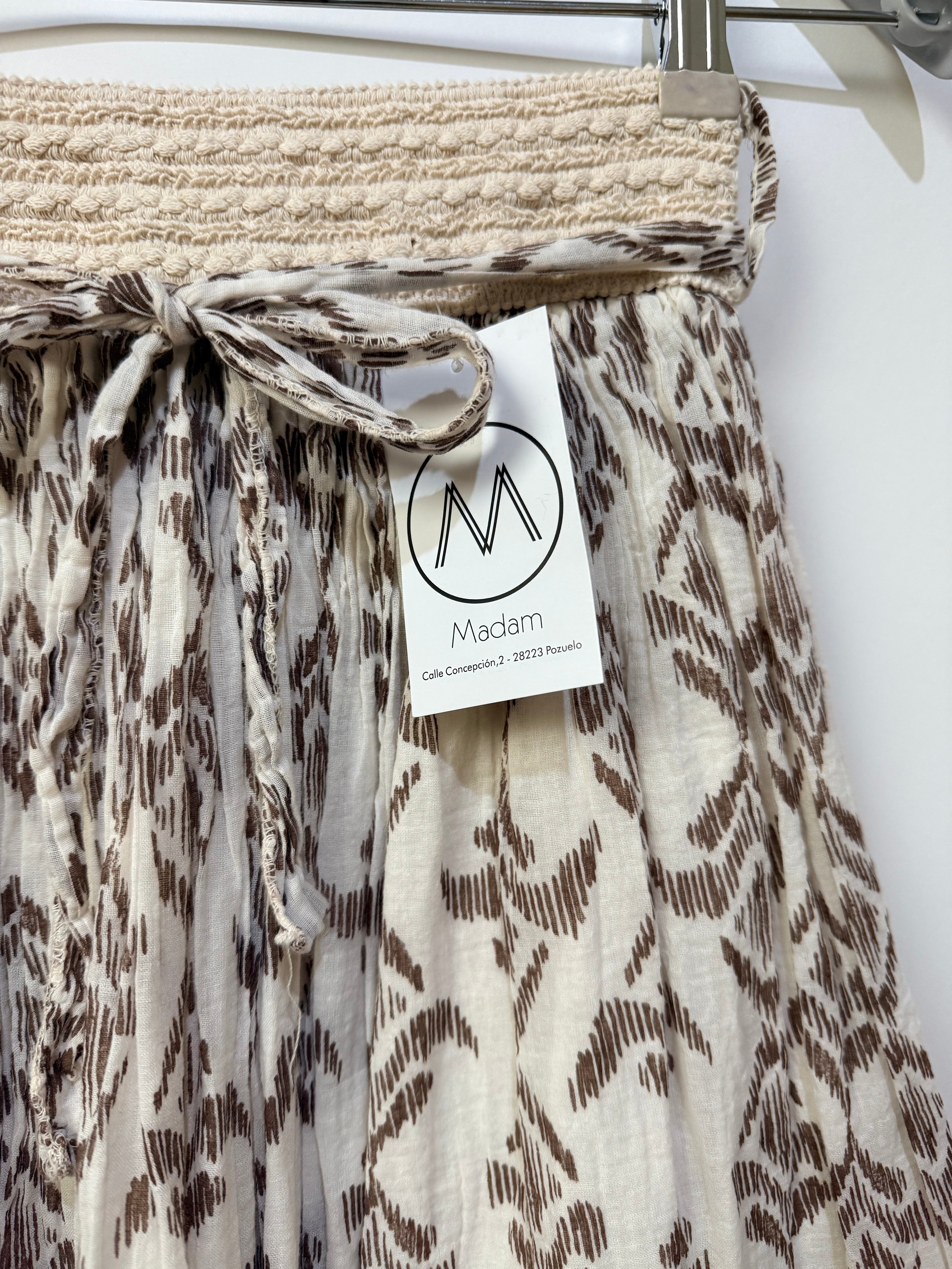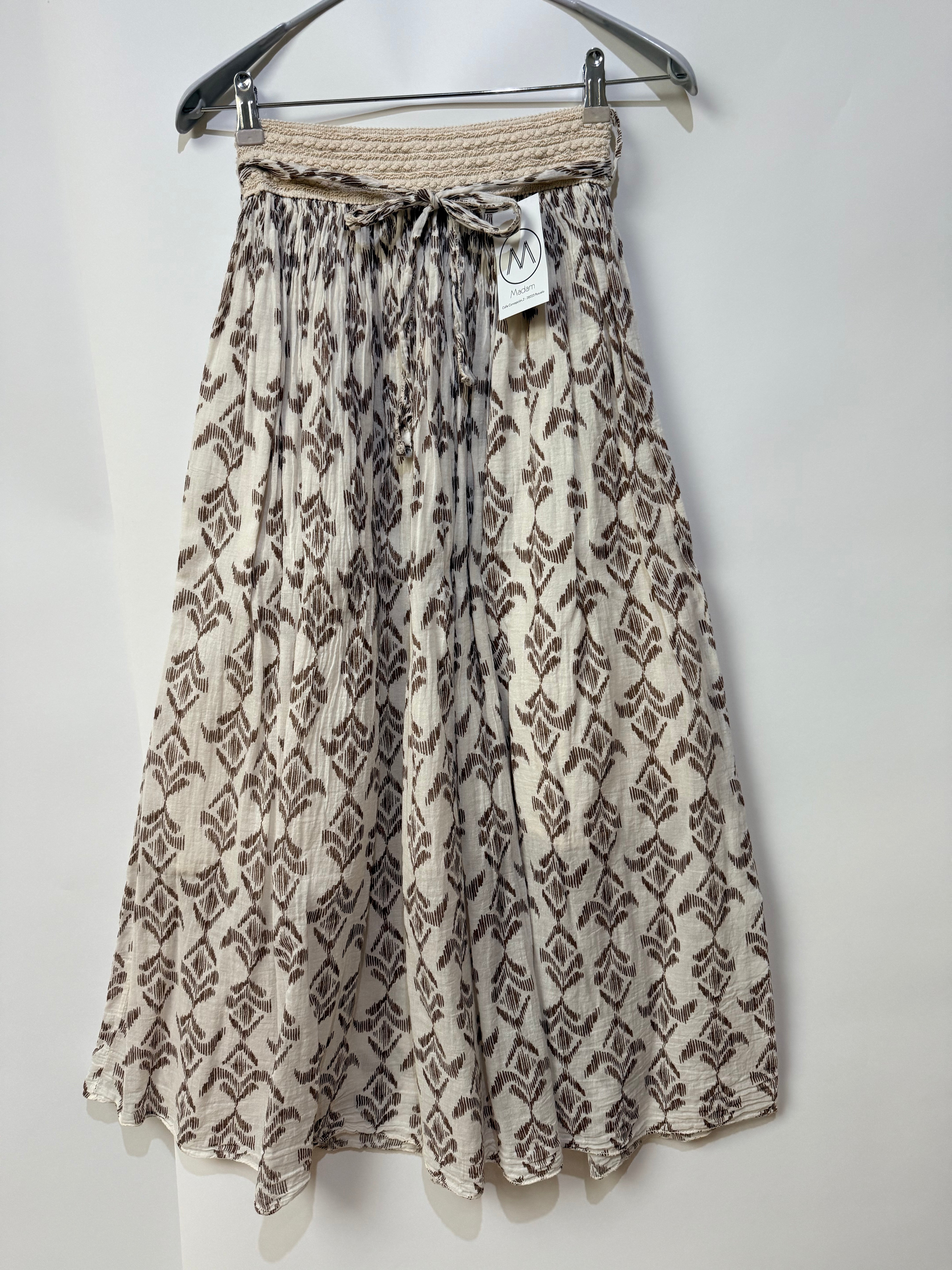 Falda midi en tono beige con estampado geométrico en marrón, confeccionada en tejido ligero y fluido que aporta movimiento y comodidad. Su diseño presenta una silueta amplia y vaporosa que crea una caída natural muy favorecedora.