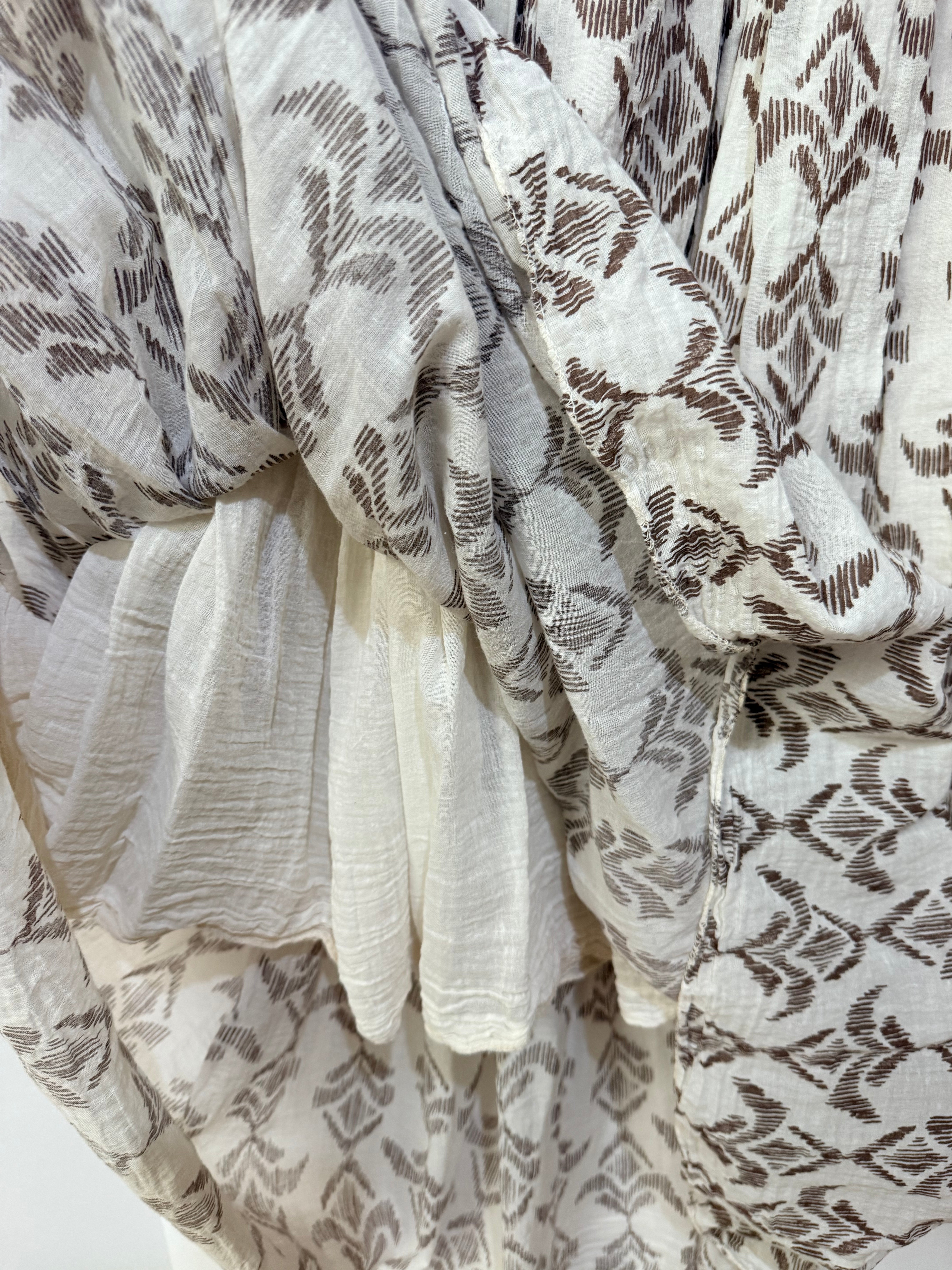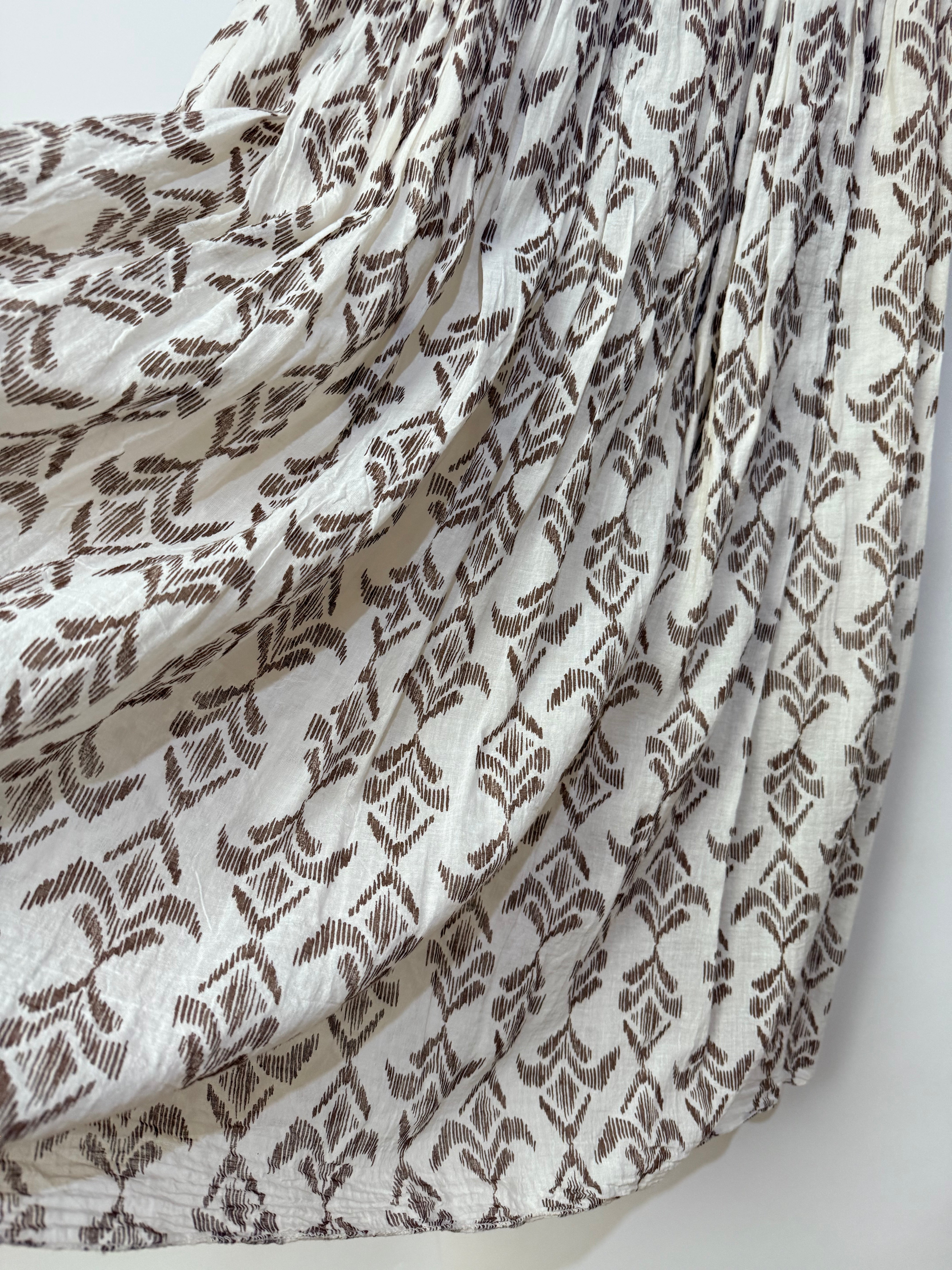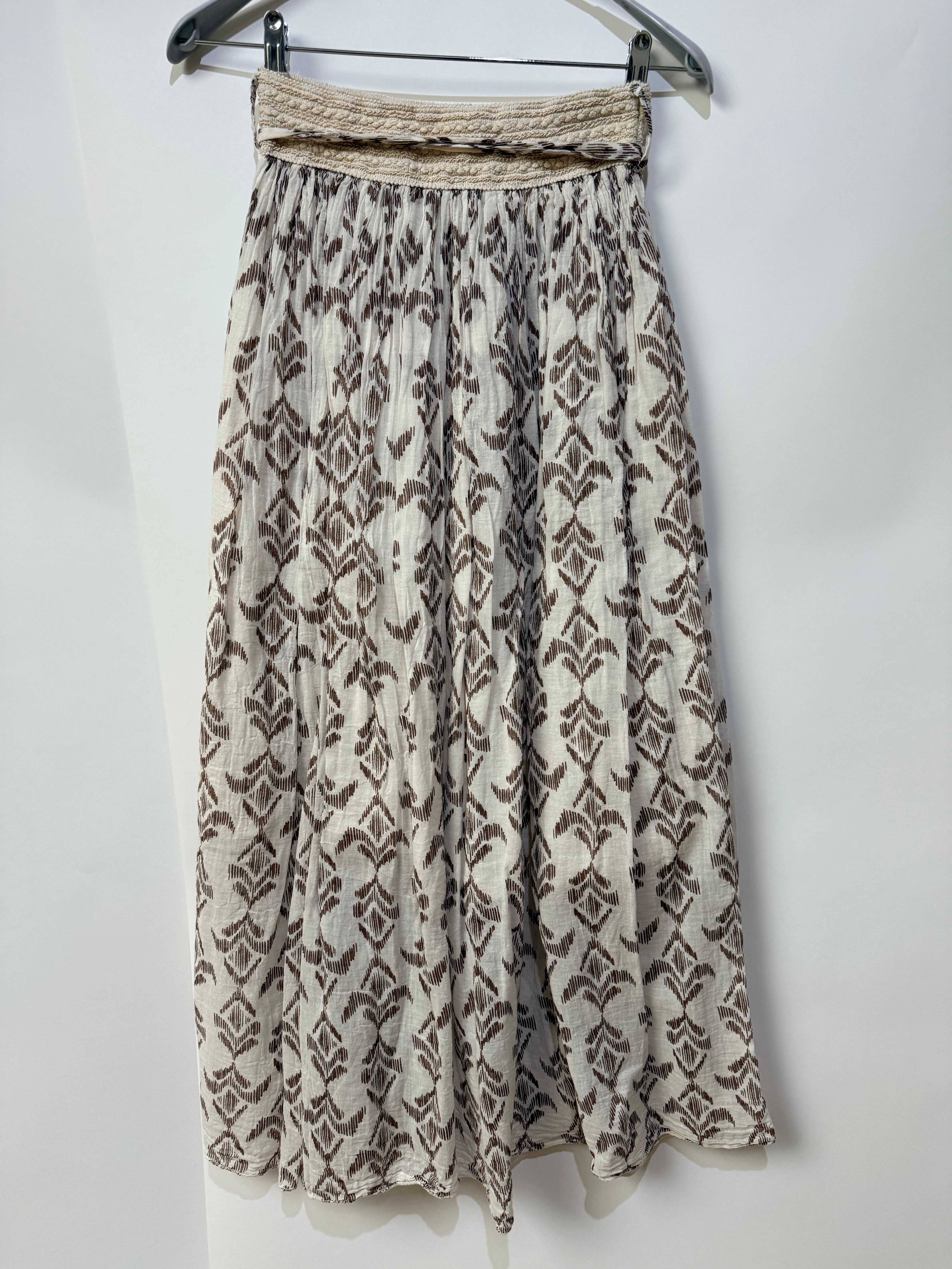 Falda midi en tono beige con estampado geométrico en marrón, confeccionada en tejido ligero y fluido que aporta movimiento y comodidad. Su diseño presenta una silueta amplia y vaporosa que crea una caída natural muy favorecedora.