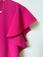 Vestido midi en vibrante color fucsia de la firma italiana Patrizia Pepe, confeccionado en tejido fluido con una caída elegante que realza la silueta. Presenta un favorecedor escote en pico y mangas cortas con volante que aportan movimiento y un toque femenino al diseño.